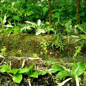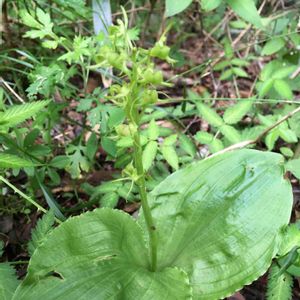 山奥自宅裏山と一体化した裏庭にて たくさんのクモキリソウが見ごろを迎えた レタスみたいな柔らかい緑の葉 真っ直ぐに伸びる緑の茎 花といってもたいした花ではない緑の花 ぜーんぶ同じ色ってのが憎いね 雨上がりの晴れた早朝はいっそう瑞々しい美しさ おはよ 今日もよろしく