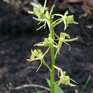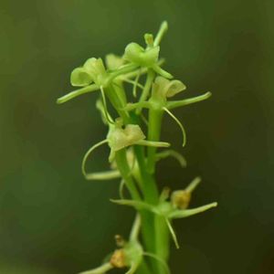 蜘蛛切草、雲霧草 ラン科 花は時に淡紫褐色、黒褐色と変異がある。 山中林の日陰、石畳の脇で何本かかたまって咲いていました。 薄緑色の小さな花が綺麗でした。