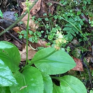 クモキリソウ ラン科クモキリソウ属 日本全国 日陰の岩礫地に生える。 🍀は広楕円形、2枚対生し縁は波打つ。🌼💮は緑色、上pic 横に2本の咢片、下に2本の側花弁、4つ突きだしている。🕷️ 蜘蛛は8本足、半分に切れば 4つ ゆえに クモキリソウ。