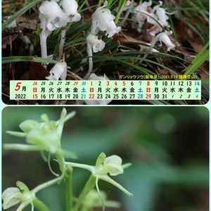 2022年カレンダー 5-6 ✌️✌️✌️📅📅📅✌️✌️✌️ ⬆️ 5/18 新津丘陵 みんな知ってる、ギンリョウソウ(銀竜草)。葉緑素を持っていない植物では一番有名。腐生植物と言われるけど。腐生植物、寄生植物、その辺の線引きがよくわからない。マッ、イッカ〜。この日は、雨後の銀竜草、アッチコッチでニョキニョキ、フレッシュな花を咲かせてました。ギンリョウソウを美しいと思ったのは、初めてでした。 ✌️✌️✌️📅📅📅✌️✌️✌️ ⬇️ 6/22 新津丘陵 クモキリソウ(雲霧草)。漢字表記は新シリーズの始まる仁左衛門様に敬意を表して、雲霧草‼️。ネットで情報を見つけて、早速、マッハGoGoGo、思惑通り、初めての出会い,ヤッタ〜ヤッタ〜ヤッターマン。でも、その奔放な姿を上手く撮れない、残念、ヘタクソ。マッ、イッカ〜。出会えた事に感謝。 ✌️✌️✌️📅📅📅✌️✌️✌️