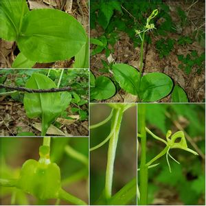クモキリソウ(雲切草)が咲き始めました♪ 柔らかそうな葉が2枚♪ 花の作りがわかりやすいようにコラージュで名前を入れてみました! この株が1番花♡︎ʾʾ まだ花芽を付けた株が沢山見られ今年は豊作かな (*˘︶˘*).。.:*♡