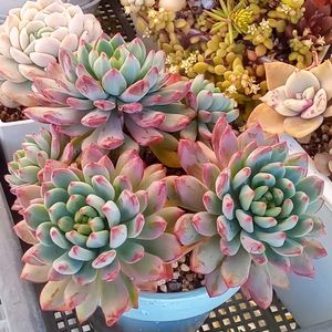 ブルーエルフ🩵が可愛くなってました😍植え替えてあげないと😅 ②昨日の雨で群生していたのがモリモリしてきた🩷 ③色々多肉チャンが紅葉してきて可愛いです😍