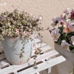 いつものお花屋さんで、元気モリモリのリトルミッシー苗を発見………👀 連れ帰ってきました🙆 なんてことをちょっと前にも言っていたような。 はい、その時の斑入りグリーンネックレスは、本気出して素焼きに植えました✨ 両方ひさびさのお迎えですが、うまくいきますように🙌🌱 🏷錦の日 初参加します よろしくお願いします🍀