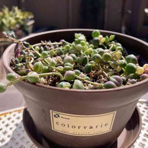 【毎月8日はネックレスの日】 【斑入りグリーンネックレス】 日付、変わりました😅 なかなか、苦手意識の強い斑入りグリネ📿ですが今のところは外で、いきいきと育っています。夜はダンボールか、プチプチで覆っています。 斑がピンクがかってくると、綺麗なんだけどね💕 葉緑素のまったくないところは、絶対に育ちが悪くなるうえ日焼けするので、近いうち✂します。