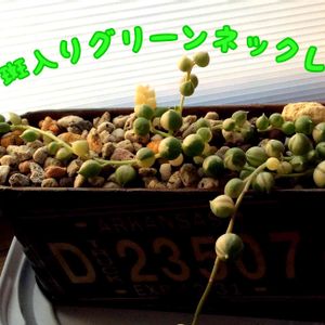 グリーンネックレスの花芽がピンピンきてます。 可愛らしいですね 斑入りグリネ可愛いですよね。この子は三代目です、いつも失敗してしまいます。 三代目は今の所は順調に伸びてきてるんで嬉しいです。