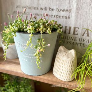 こんにちは〜ܾ ܾ 𖥧𓇣𖦥𖥧𖥣 朝から冷たい雨が降ってて、とっても寒いです⋆̩☂︎*̣̩ このかわいい、斑入りグリーンネックレスを見てやってくださ~い(*≧∀≦*)先週、園芸店で見かけて難しい子だから、どうしようσ( -ˇ.ˇ-。)ウーンと迷いに迷って.........お迎えしちゃいました(^_^;)置物のネコちゃんも斑入りのグリネをキレイだなぁって見てると思います🎶¨̮