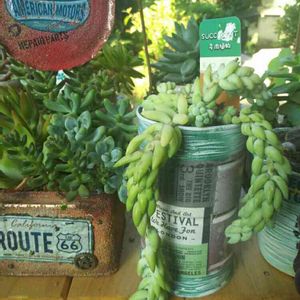 今日も・・夜の多肉シリーズ 玉つづりさんは昨年から多肉さん・・ リメ缶でわかっちゃう💦💦 途中がもげて寂しくなってますけど・・徐々に垂れ下がってくれてます