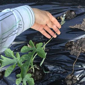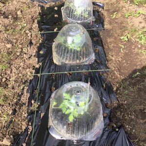 やっと定植した小玉スイカ。 真ん中は黄色スイカ。 きょうは大雨☔️の予報なのでホットキャップでカバーしておきます。
