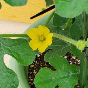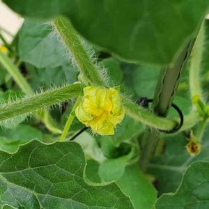 先日、3つの雌花に人工受粉した後、大雨で2つはダメになり、ひとつはスクスク成長中。 今日新たに2つ人工受粉。 うまくいきますように🙏