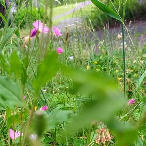 風に揺れていた草花 ピンク色のお花がゆらゆら!! 夕化粧 ユウゲショウ 庭石菖 ニワゼキショウ 瑠璃庭石菖 ルリニワゼキショウ 公園の片隅に見つけたおとぎの国!! 虫になった気分で!!