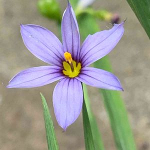 ルリニワゼキショウ なんといっても特徴は、茎に幅広の翼があり、まるで葉っぱ🌿から花が出てるように見えることです😍 花弁の先に芒状の突起が出てるのも特徴の一つ、色は基本この色合いですね。