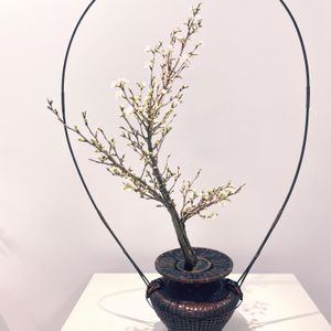啓翁桜🌸を大弦籠(ぼたん籠とも言います)に生けました。会場は新宿高島屋でした。 つぼみが固く開花までなんと6日もかかりました😅 くさびを沢山入れてため(曲げ)て形作りしています。 枝を半分近くめの細かい鋸で切り、枝の口を開け、そこに△に切ったピースをはめ込み少しずつ曲げていく「くさびだめ」という方法です。 とてもきれいに咲いてくれてお客様の目を楽しませてくれました😍 籠は、手の部分は外れて細かくはめてこのような大きな手を作ります。 この大弦籠だけでも優雅な雰囲気を醸し出してくれています。 それに桜ですので、私たちを別世界に連れていってくれます🌸