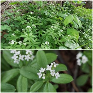 クルマムグラ(車葎) *アカネ科ヤエムグラ属 花期は6〜7月 北海道〜九州の山地の林内に生える多年草! 高さは20〜50cm 葉は披針形で先は尖り6個の輪生状! 茎の断面は4角形で稜上や葉は無毛! 茎頂に4裂した白い花を数個〜十数個付ける! 果実はかぎ状の長毛が密生! ①全体と6個輪生の葉 ②稜はあるが無毛 ③花冠は4裂し 雄蕊4個 ④オククルマムグラ❗️ 花はほとんど同じ! 深山に生える事に加えて茎の4稜に下向きの刺状の毛があり、葉の縁にも毛が生える事で区別出来る (5/12氾濫原) 5月17日撮影 仙台市 秋保大滝付近