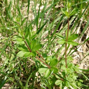 オククルマムグラ(奥車葎) アカネ科ヤエムグラ属 多年草 クルマムグラに似るが、茎や葉の裏面中脈に下向きの刺状毛がある。 葉はふつう6個輪生し、長楕円形で長さ2.5〜4cm、先端は短くとがる。 7月6日 場所:焼岳