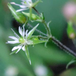 オオヤマハコベ ナデシコ科ハコベ属 多年草 在来種 本州(岩手県以南)、四国、九州に分布 山地の湿った林内に生える。 名前の由来は大型のヤマハコベの意味である。 花期8〜10月 高さ40〜100cm 茎は直立して上部で分枝し、腺毛がある。 葉は対生し、披針形、卵状披針形、長楕円状披針形で、基部はくさび形、縁は全縁でややしわがよって波打つ。 花の径は約1cmで、上部に大きな円錐状の集散花序を出し、多数頂生する。 萼片は5個 花弁は白色で5個で、萼片より明らかに短く、爪部が細く先に2裂し、裂片は尖る。 雄しべは5個あり、花弁より長く、葯は黄白色。 子房は胚珠3個を含み、卵球形になり、その上に3個の花柱がある。 🏷️白い水曜日♡ に参加させていただきます。