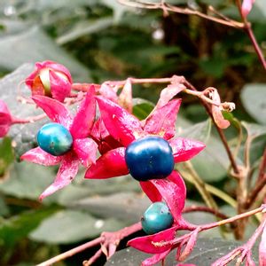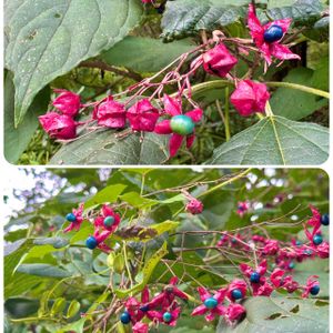 クサギの実が鮮やかな濃紅色に染まって、その中の果実の色とのコントラストが美しいです💕 濃紅色は萼の色、果実は紺色が熟した姿で、熟すまでの色の変化もまた美しいですね。