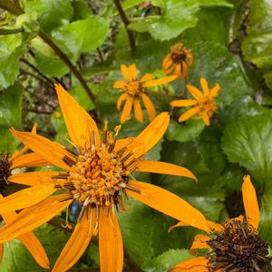 ①② マルバダケブキ キク科 メタカラコウ属 和名は、山に生えるふきに似た植物という意味、でも、有毒なので、要注意です。 ③④ オタカラコウ キク科 メタカラコウ属 漢字では、雄宝香、根が、防虫剤や香料にする宝香(樟脳)に似ていることが名前の由来になっているそうです。 ビタミンカラー、元気の出る色で咲いていました🧡💛