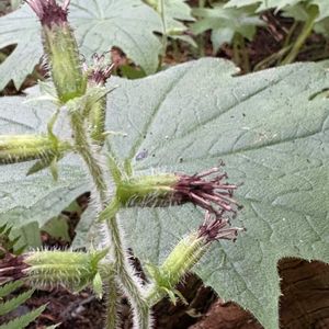 オクモミジハグマ キク科モミジハグマ属 多年草 モミジハグマの変種である。 本州の青森県三八地方以南(中部地方から西側は日本海側)と九州北部に分布 山地の木陰に生育する。 オクモミジハグマは「奥紅葉白熊」のことで、「紅葉(もみじ)」は葉の形がカエデ(もみじ)に似て、「奥」は基本種のモミジハグマより北に分布するので付けられた。また、「白熊(はぐま)」とはヤクの尾の毛で作った槍や兜、僧侶の払子の飾りをいい、花冠の細長い裂片の様子を白熊に見立てたものである。 花期8〜10月 茎は直立し、高さ40〜80cm。 頭状花序は総状に多数つき、開花時には横向きになる。 花柄は長さ2mmで小さい苞がある。 頭花は3個の筒状花からなり、花冠は白色で4〜5裂し、左右対称。裂片は線形でよじれる。