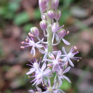 ツルボ キジカクシ科ツルボ属 多年草 別名はスルボ、サンダイガサ 北海道南西部〜九州、琉球列島に分布。 林縁や堤防草地などの日当たりの良いところに多く、時には群生を作る。 花期8〜9月 葉の間から細長い花茎を伸ばして、総状花序をその先端につける。 花茎の高さは20〜40cmで、花序は細長い円筒形で、下から開花していき、長さ3〜10cm幅1.5〜2cmである。 花は密集して、長さ3〜6mmの花柄がある。 花被片は6個あり、長楕円状倒披針形で長さ4mm、先端は尖り、淡紅紫色で平らに開く。 ⑤シロバナツルボ ツルボの白花種 (日光植物園にて撮影)