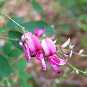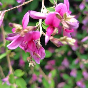 ミヤギノハギ マメ科ハギ属 落葉小低木 本州の東北地方、北陸地方、中国地方に分布 名前の由来は、宮城県仙台市郊外にあったハギの名所の「宮城野」を原産地とする説や地名とは関係なく、花の美しさを表すために「宮城野」という名が付けられたという説がある。 夏に咲くため、ナツハギとも言われる。 ハギ(ヤマハギ)よりも派手な花が咲き、長さ1.5cmほどで、ハギと総称される植物の中では最大である。 枝先から垂れ下がった花序は、葉より明らかに長く、紅紫色の小花を円錐状に多数咲かせる。 ハギの中では人気が高い。 葉は葉の先が尖り、大きさも少し大きいのが特徴である。 花期6〜9月だが、咲き始めはヤマハギより早い。