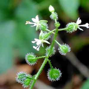 ミズタマソウ アカバナ科ミズタマソウ属 多年草 在来種 北海道〜九州に分布 山地の樹林内など湿った日陰に見られる。 花期8〜9月 茎先や葉の脇から伸びた花柄に小さな花を1輪ずつ咲かせる。 花弁は白あるいは淡い紅色のものが2枚ある。 果実は直径3〜4mmで、まん丸だが表面は鉤状に曲がって白い毛に覆われている。俗に言う引っ付き虫である。