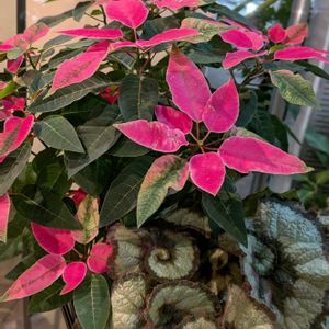 エスカルゴ 軒下に取り込みました。 短日処理後、落葉でスカスカになったプリンセチアピンクの足元へ。 まだ新芽は出てます☺️