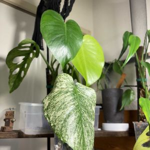 モンステラ デリシオーサ ホワイトモンスター 3枚目の葉が斑が入ってなかったんで通常の葉かな?って思ってたら薄い緑 斑入りではないけど色んな葉を出してくれるので楽しみになってきました