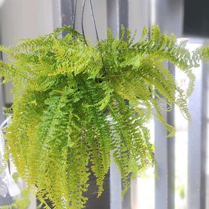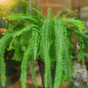 謎ネフロレピス🌿🌿 うちで一番繊細なシダ。 風通しを考慮して外管理。 向かって左半分は直射日光が当たります。 向かって右側は、明るい日陰。 写真ではわかりにくいのですが、生育状態の違いが一目瞭然です😊😊 吊る方向を変えないと💦💦