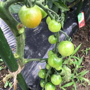 ミニトマト🍅品種はタキイの千果🌟 タキイさんのホームページ見ると、糖度が高く最高品質のミニトマトとのことです✨が❗️ 赤くなったものを採ってみてはいるんですが、まだ結構酸っぱい🐶 収穫適期、いまいち分からんです😁💦
