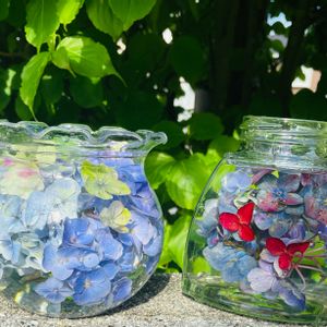 おはようございます。 昨日は暑かったですね。 今日も気温↑かなり上がりそう。 今朝 花友さんの涼しげな 由緒あるお寺の 花ボールを見て 真似っこしちゃいました。 うちの💙💜🩵紫陽花は終盤 色鮮やかではありませんが 💜💙🩵❤︎*.(๓´͈ ˘ `͈๓).*❤︎💙💜🩵 右のは金魚がいます。🤭🤭 ヤマアジサイ ♥️紅です。 職場に持参します。 今日も良い一日をお過ごしくださいね。