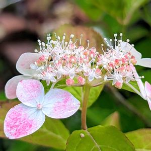 ヤマアジサイ紅が咲き始めました。白い装飾花がこれからピンク、そして深紅に変化していきます。色の変化が楽しみ✨🤍🩷♥️🌿 左の赤い蕾が開いたお花も、蕊がツンツンしていて可愛い💕