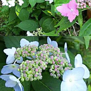 我が家の山アジサイが咲き出しました 青いのが王冠、白が紅(くれない)なんだけど白からまだ赤くなりません 日向に置いてみたけどこの暑さで弱ってしまいます 紅くなったらまた投稿しますね