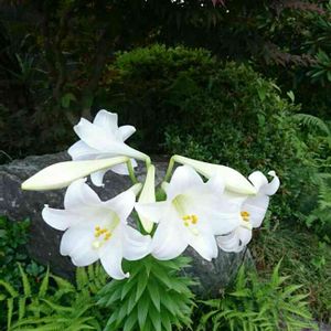 玄関アプローチの入り口に一本☝ 植えた覚えのない鉄砲百合が🌿 存在感を増してきました😅 一本から7つの花をつけ…そして 下からもおまけが☝…😊