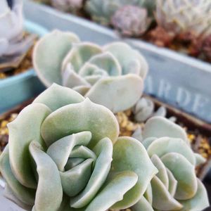 ラブリーローズの親子連れ 2021年9月27日 一番上の綺麗な子がカット挿し木です。 その対角線が親株です。 夏に取れた葉を置いておいたら芽が出てきました。 下のプラステラが今年の春の葉挿しっ子です。 ラブリーローズ、名前も可愛らしいのですが1年足らずでこんなに増えて丈夫で育て易いのかなぁと思います。
