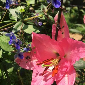 ユリさんとブルーウイングさん💕 予報に反して陽射しが出た庭ではまだ咲いていなかった百合が蕾をひらかせていました💗 良い香り〜🎶 ブルーウイングさんも雨で花を落としながらも咲いてくれていました💙