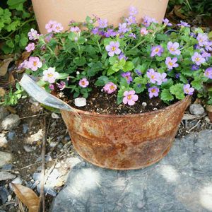 紫とピンクの花が咲くバコパです 最初地植え薔薇の足元に直接植えてたのですが 元気が無く成ってブリキの鉢に植え直しました 今では良く枝を八方に伸ばし 小さな花が良く上がります これは花柄取りが面倒でね 細かいケアをします 今日は伸び過ぎた金木犀を強剪定します 今秋花は少なく成るかもだけど 次の休みには椿を切るつもりです