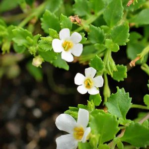 バコパ・コピア 別名:ステラ・コルダータ ゴマノハグサ科の半耐寒性常緑多年草です。 細い茎が這うように伸びて、小さな花が株一杯に咲き続けます。開花時期は真夏を除いて周年です。花数が多く花期が長いので、寄せ植えやハンギングバスケットの素材として人気が高い植物です。 茎や葉には毛が生えていて、葉は卵円形で対生します。葉の縁には粗い鋸歯があります。