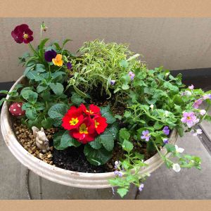 こんばんは🌆 寄せ植えしてみました♡ センターは単体で植えてた プリムラ・ジュリアン❤️ にやっぱり登壇して もらいました😊 左🌱ビオラ2色 後🌱スーパーアリッサム フロスティーナイト 右🌱バコパ コピア スーパーアリッサムは 今から白い小花がたくさん 咲いてくれるかなぁ💕 ビオラさん達ももう少し モリモリになってくれる かしら〜💕