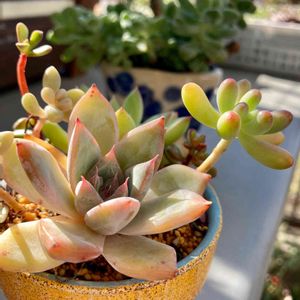 風が強くて雨晒し多肉ちゃん達には良い天気👍🏻 みんな一回り大きくなった気がするな〜😅 ぴょんと伸びた乙女心が可愛いな💕 ほんのりピンクの主役の子💕誰やっけ❓