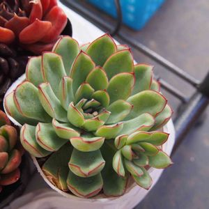 今日は寒い〜!!時折雪がチラチラ⛄️ さて、名前教えてください第2弾💦 昨日、タグ回答してくれた方、本当にありがとうございました(o^^o) 今日はコチラお願いします💦 エケベリア。紅葉中なのか葉の縁が濃い赤色です。398円だったから、珍しい子ではないと思います(^^;; 花うららより、緑色で青みは無しです。 ピンときた方がいましたら、教えてもらえたら嬉しいです😊