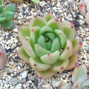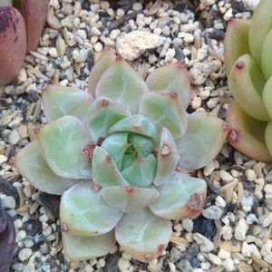 🍀エケベリア(名無し)🍀 葉の一部が白い。あなたは斑入りでは無いと思うが?笑 これも高温障害の一種かな?🤔 中心部が元気そうだから大丈夫だと思うけど😌