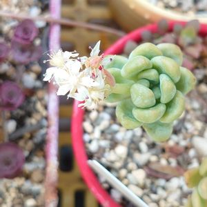 雨が降ったり止んだりの1日☂️ 葉挿しで、2年かけてやっと5.5cmになった子が、お花を咲かせてくれました。しかし、お得意の名無しちゃんです。 名前分かる方、教えて下さい🙇♀️