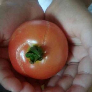おはようございます! 今朝はつよまるの収穫をしました!長女のお手手にすっぽりの中玉サイズ。実が割れてしまいました。早速朝食に切って食べてみたら、ちょっとすっぱいけど、何となく塩味もあって美味しかったです!