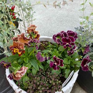 おはようございます☀ 何度か投稿させて頂いている定植して1ヶ月程経った寄せ植え💜 ビオラファルファリア、ネメシア、ロータスブリムストーン、右側には黒葉牡丹を寄せています😊 今日も素敵な1日をお過ごし下さい✨