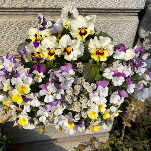 好きなお花を バスケットに詰め込みました🎶 (*˘︶˘*).。*♡ フリル咲きパンジー ラベンダープリンセスゴースト ロータスブリムストーン バコパ ベアグラス