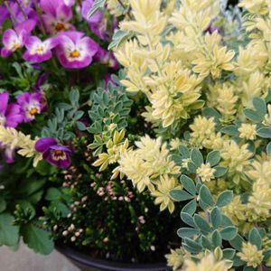 2/13にupした寄せ植えのジャノメエリカが大きくなったので独り立ちさせてあげ、その代わりにユリオプスゴールデンクラッカーが仲間に入りました