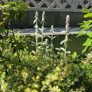 ロータスブリムストーン越しのラムズイヤー。ヒョロヒョロです。冬から春まで日当たりが悪くなるからかな。