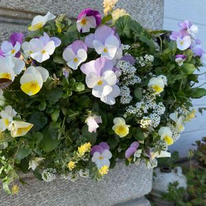 おはようございます😃 ビオラ🌸 ロータスブリムストーン🌿 久しぶりにいい天気😍 天気がいいと幸せだ〜😆 ビオラとブリムストーン寄せ植え。かわいくて優しい雰囲気にほっこり🥰