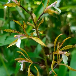 トケンラン 🌱ラン科 サイハイラン属 ✽高さ25〜40cmの多年草 ✽葉は花後枯れ、秋にはホトトギスの胸のような暗紫色の斑点が目立つ新葉が出て越冬する ✽花はまばらに10個前後つく ✽がく片3個と側花弁はふつう紫色の斑点があるが、唇弁は白く先が3裂し、基部付近に側片がある ふつう萼片、側花弁に黃褐色の地に暗紫の斑点があるが、無い個体もあるようです! 今回は斑点が無く、あっさりした感じでした🌱 風との戦いで上手く撮れませんでしたが🍃