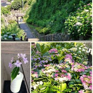 紫陽花 ここは極楽寺にある成就院です。 今は縁結びの不動明王さまで有名です。 来年は創建800年、参道の復興工事が終わりました。 以前の紫陽花をご存知の方は、少なくなってしまった紫陽花に驚きですが、262株は南三陸町へ寄贈されました。 代わりに宮城県花の萩が植えられています。 秋が楽しみです。 切り通し側は紫陽花が咲いていますので、楽しめます。 💗💜💙 みどりのまとめ、投稿しましたのでご覧下さい🍀